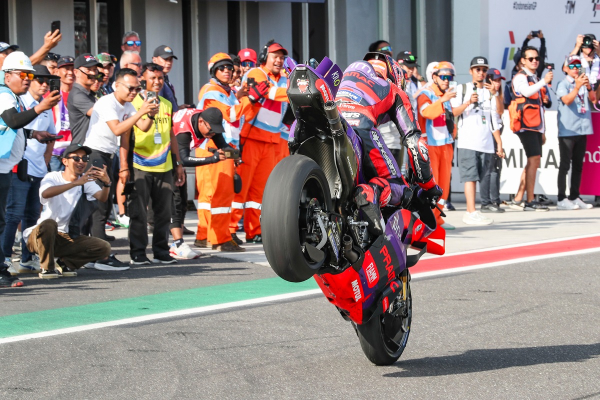 Ao ganhar este domingo em Mandalika, o espanhol da Prima Pramac parou na curva em que tinha caído no dia anterior para comemorar, um festejo que comentou assim: ‘Não fui original, porque fiz o mesmo que o Pecco [Bagnaia] em Montmeló depois de cair naquela curva. Sim, então não fui realmente original, mas parei e beijei o solo, portanto foi um bocado diferente’.
