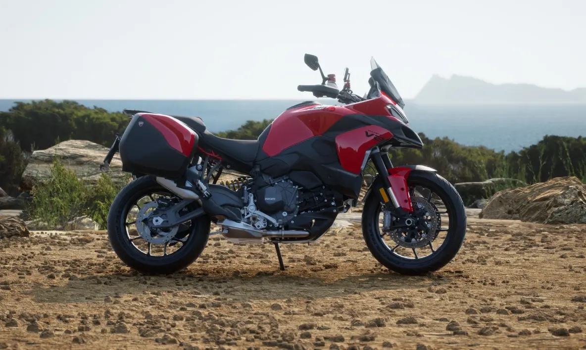 A Multistrada V2 combina versatilidade, performance e aptidão touring. Para potenciar estas características, o catálogo oferece o pack Touring (97981541AA), que inclui alforjes laterais de plástico com suportes, cavalete central e punhos aquecidos.
