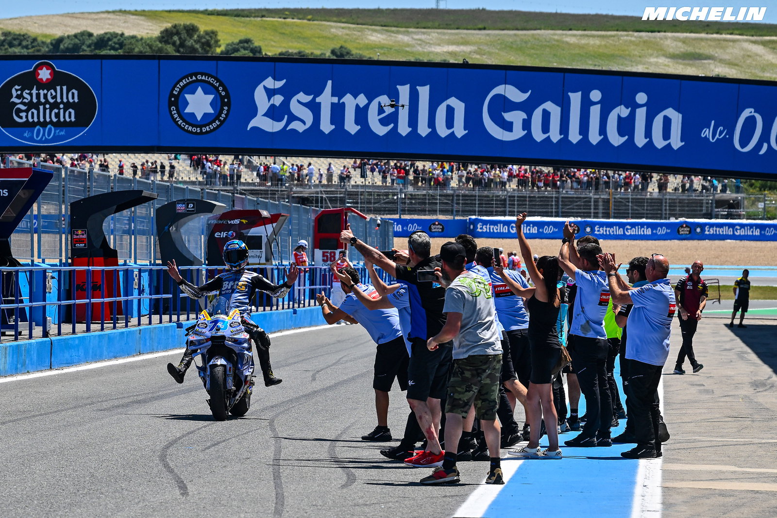 Sobre o impacto emocional do fim de semana e o desafio de absorver a conquista, Márquez acrescentou: ‘Não foi um fim de semana fácil para isso. Estava ainda a tentar aceitar ou perceber o que fizemos no domingo, mas foi bom dormir um pouco mais, na segunda-feira, mais relaxado, mais tranquilo. Mas, sabes, felizmente havia teste, por isso não pude celebrar muito’.
