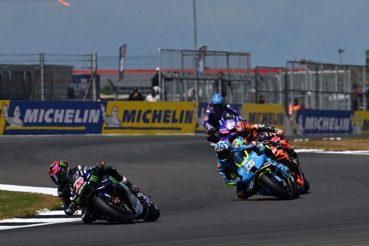Álex Rins viveu uma corrida atribulada em Silverstone, marcada por dificuldades técnicas com o aquecimento do pneu traseiro e incidentes perigosos, incluindo um susto com Pecco Bagnaia.