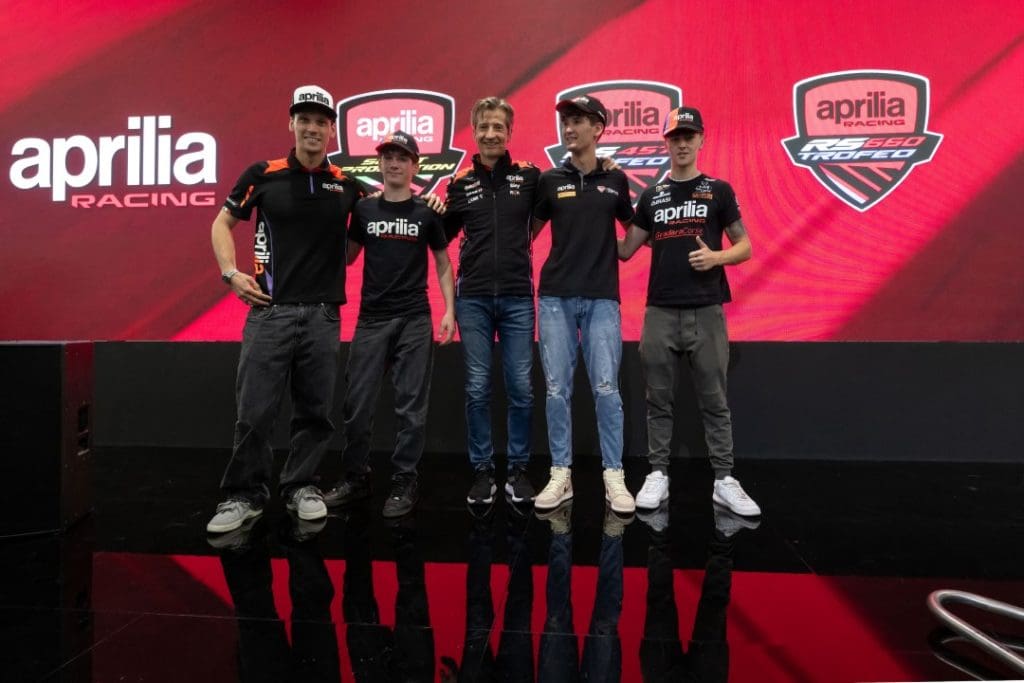 A celebração começou com os protagonistas do Troféu Aprilia 2024. Thomas Benetti, campeão do Campeonato Italiano FMI Aprilia Sport Production, e Filippo Bianchi, vencedor do RS 660 Aprilia Trophy, foram aclamados no palco. Juntou-se a eles Tommaso Marcon, peça-chave no desenvolvimento das motos do Troféu. Outro destaque foi Edoardo Colombi, que, no seu ano de estreia, alcançou impressionantes oito vitórias e doze pódios em quinze corridas no British Superbike, ficando muito perto do título na classe SportBike.