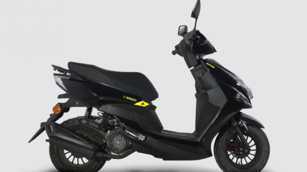 A seguir, a Motron Breezy 50 é uma scooter pequena e desportiva que é tecnicamente classificada como ciclomotor. Tem um motor monocilíndrico de 50 cc, a quatro tempos, ainda mais pequeno, com uma economia de combustível de cerca de 45 km por litro. Isto significa que um reabastecimento completo do seu pequeno depósito de combustível de cinco litros pode proporcionar uma autonomia de até 200 km – bastante impressionante, tendo em conta o seu tamanho reduzido. A Motron Breezy 50 é vendida por apenas 1.699 €.