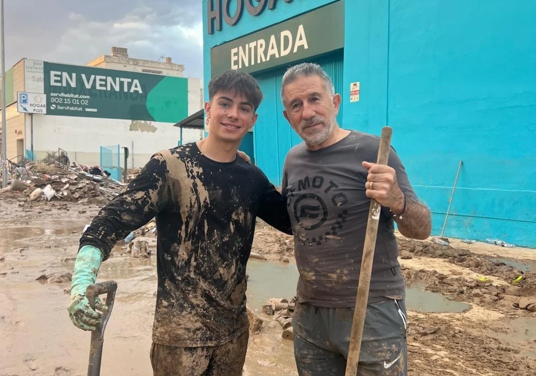 Na legenda da imagem, pode ler-se: ‘Porque juntos somos mais fortes. O campeão do mundo de Moto3, David Alonso, veio este fim de semana a Valência ajudar com as tarefas de limpeza depois das inundações’.