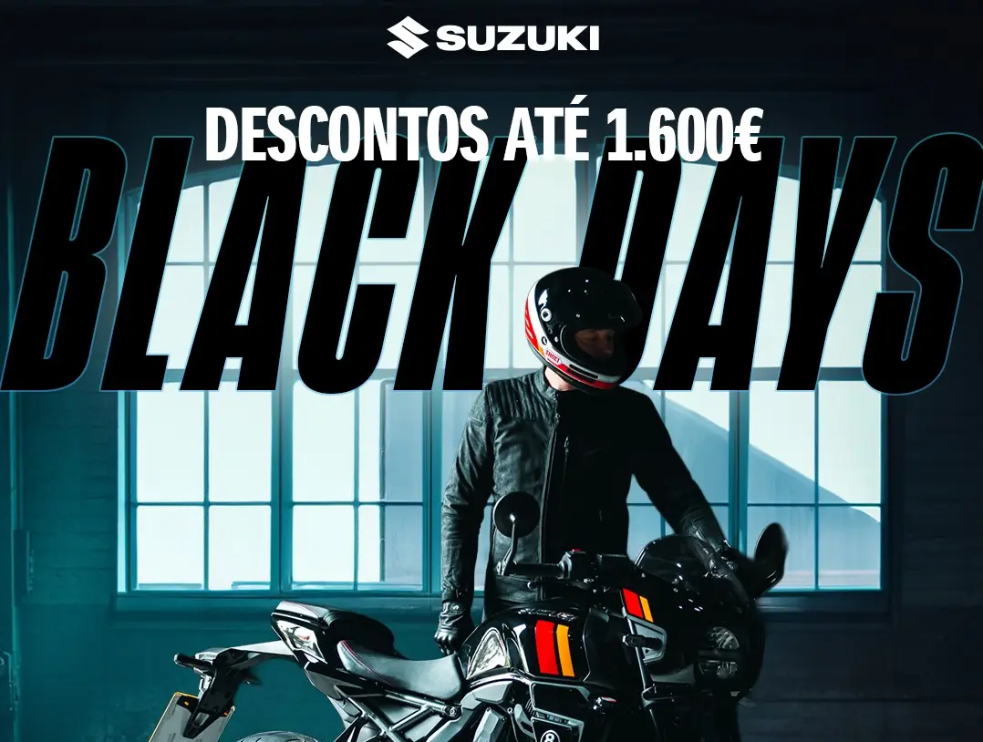 A campanha Black Days Suzuki chega ao mercado português com uma proposta de curto prazo e descontos que podem atingir os 1.600€, aplicados a vários modelos da marca. Entre 28 de novembro e 6 de dezembro, a Suzuki Portugal disponibiliza condições especiais para um conjunto de motos selecionadas, com pré-reservas possíveis desde 21 de novembro.