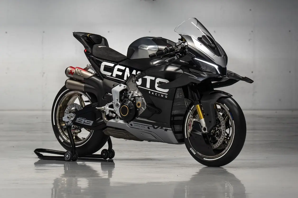 O protótipo exibe também suspensão eletrónica semi-ativa e um conjunto de ajudas eletrónicas de ponta, como seria de esperar nesta categoria. Imagens divulgadas pela CFMoto mostram duas versões: uma moto de apresentação em preto e prata com pinças MotoGP-spec, e um protótipo camuflado identificado como “Proto 5”, equipado com pinças Brembo Hypure e detalhes mais próximos da produção, incluindo descanso lateral, um para-lamas inferior alterado e peseiras ajustáveis.