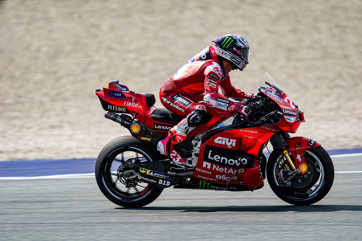 Quanto à forma como geriu a pressão do pneu dianteiro numa corrida em que teve de recuperar a meio do pelotão, o #23 explicou: ‘Em especial nesta pista pode ser um problema, mas tentei não ficar perto do outro piloto, estive sempre fora do cone de aspiração na reta, e numa corrida como esta, esta é a chave. Mas também é sempre melhor se estiveres sozinho como o Pecco [Bagnaia]. Se estiveres atrás, tens de pensar nisto’.