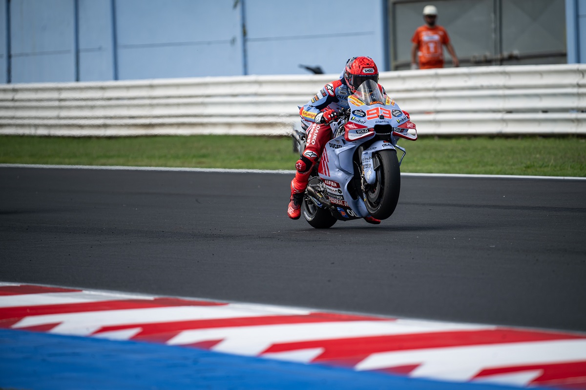 Enquanto controlava os rivais atrás, Márquez acabou por ser beneficiado com a queda de Francesco Bagnaia à sua frente de modo a ser terceiro, como referiu: ‘Estive a tentar controlar sempre o [Pedro] Acosta e o [Marco] Bezzecchi, que eram os dois pilotos que podiam lutar comigo pelo quarto lugar. Mas esse erro do Pecco deu-nos o pódio’.