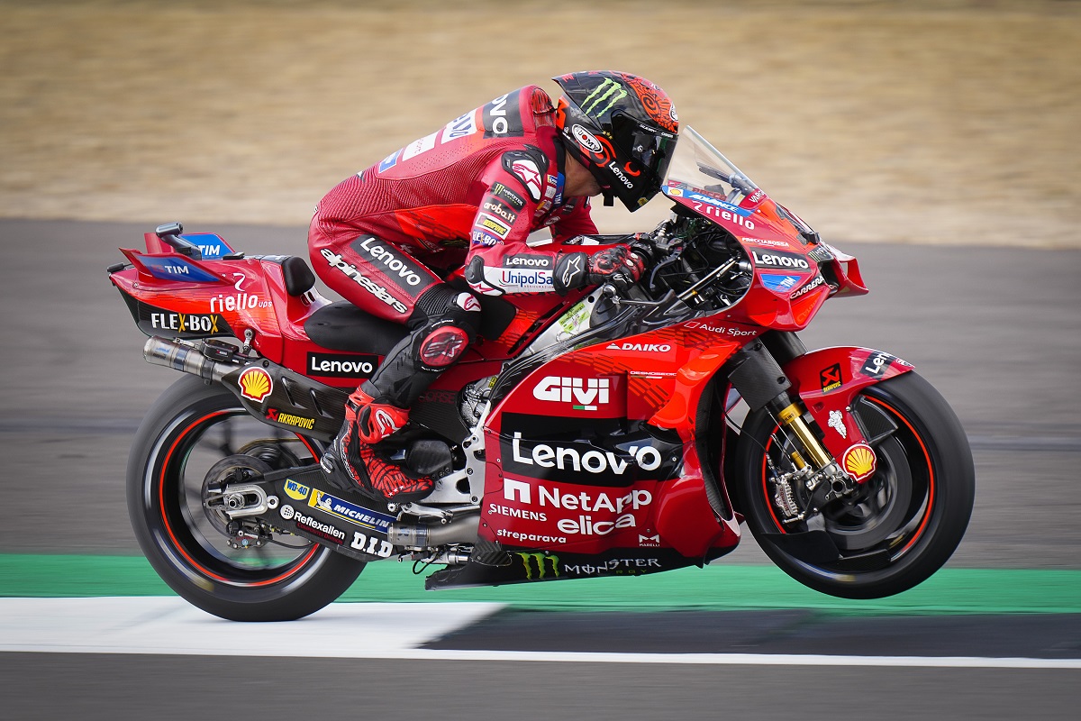 Francesco Bagnaia não evitou uma queda na corrida Sprint do GP da Grã-Bretanha de MotoGP. A seis voltas do fim, o piloto da Ducati perdeu a dianteira da moto na curva quatro quando perseguia os lugares de pódio, e teve de abandonar.