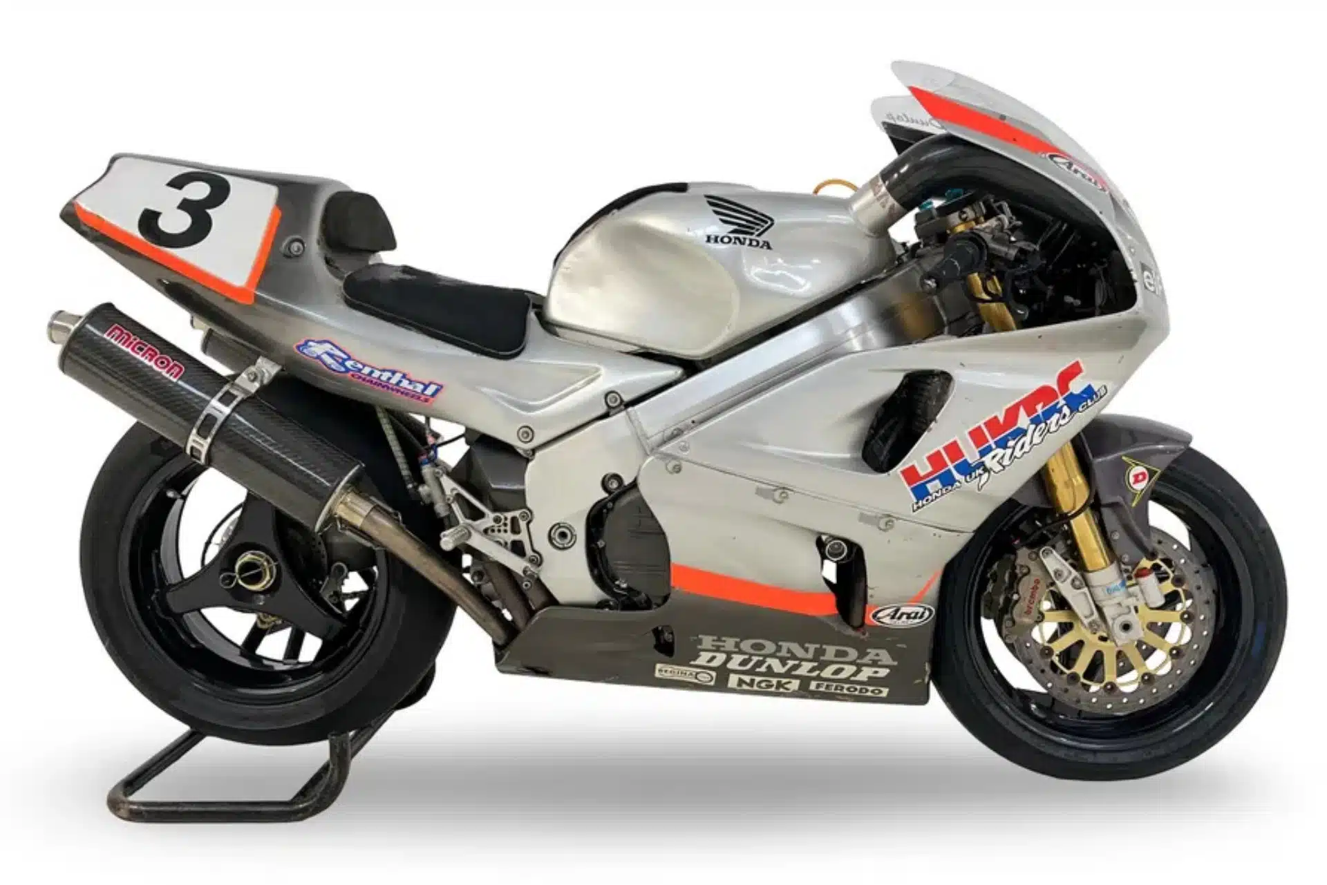 A RC45, por sua vez, atingiu um valor próximo dos 108 mil euros. Trata-se de uma raríssima unidade oficial da HRC, com especificações de fábrica e sem selagem, algo praticamente impossível de encontrar fora do paddock. Dunlop pilotou-a até ao limite, conquistando a vitória no Grande Prémio do Ulster de 1999, já com 47 anos.