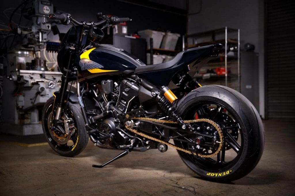 Na parte traseira, foi colocado um braço oscilante da FTR e amortecedores piggyback da Indian Motorcycle. Em termos de sistema de travagem, encontra-se um disco e uma pinça Brembo. Ambas as rodas são de 17 polegadas e da RSD Dymag, calçadas com pneus Dunlop Sportmax Q5.