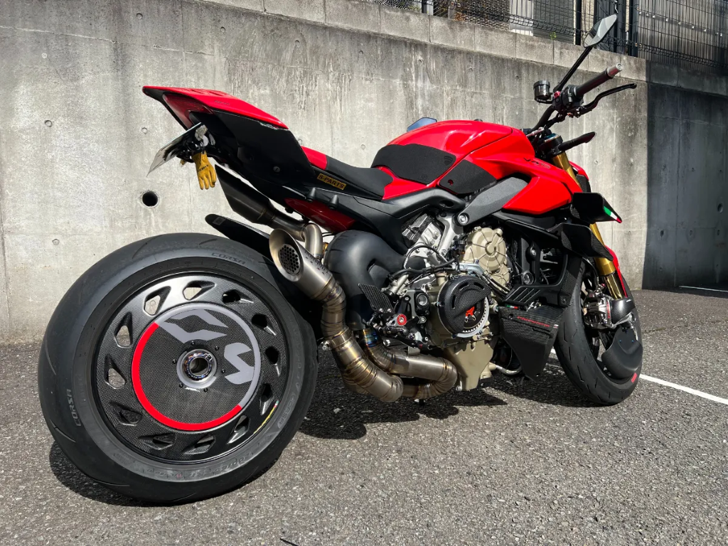 O modelo escolhido foi a Ducati Streetfighter V4S de 2024. A lista de peças instaladas é extensa e inclui: