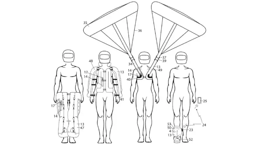 Uma das partes mais inovadoras está no colete: ‘cúpulas infláveis’ que se abrem à volta dos ombros e cabeça. Não são paraquedas, mas atuam como freio aerodinâmico e proteção lateral da cabeça, ajudando a reduzir a velocidade de impacto e a minimizar ferimentos no crânio. O sistema inclui amortecedores elásticos para evitar que estas estruturas se abram com violência.