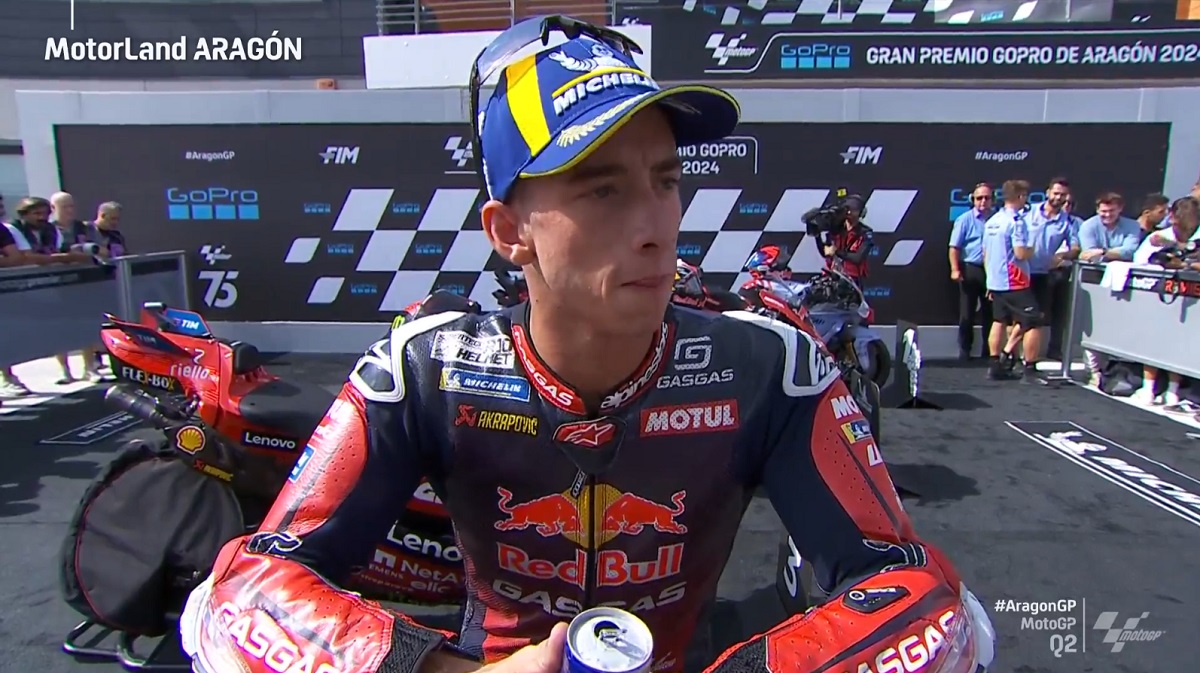 Eis a reação do piloto da GASGAS Tech3 aos microfones do MotoGP em parque fechado depois da qualificação bem sucedida: ‘Com certeza hoje… foi muito estranho perceber o que aconteceu ontem, porque é verdade que cometi muitos erros durante a volta e não estar na Q2 foi culpa minha’.