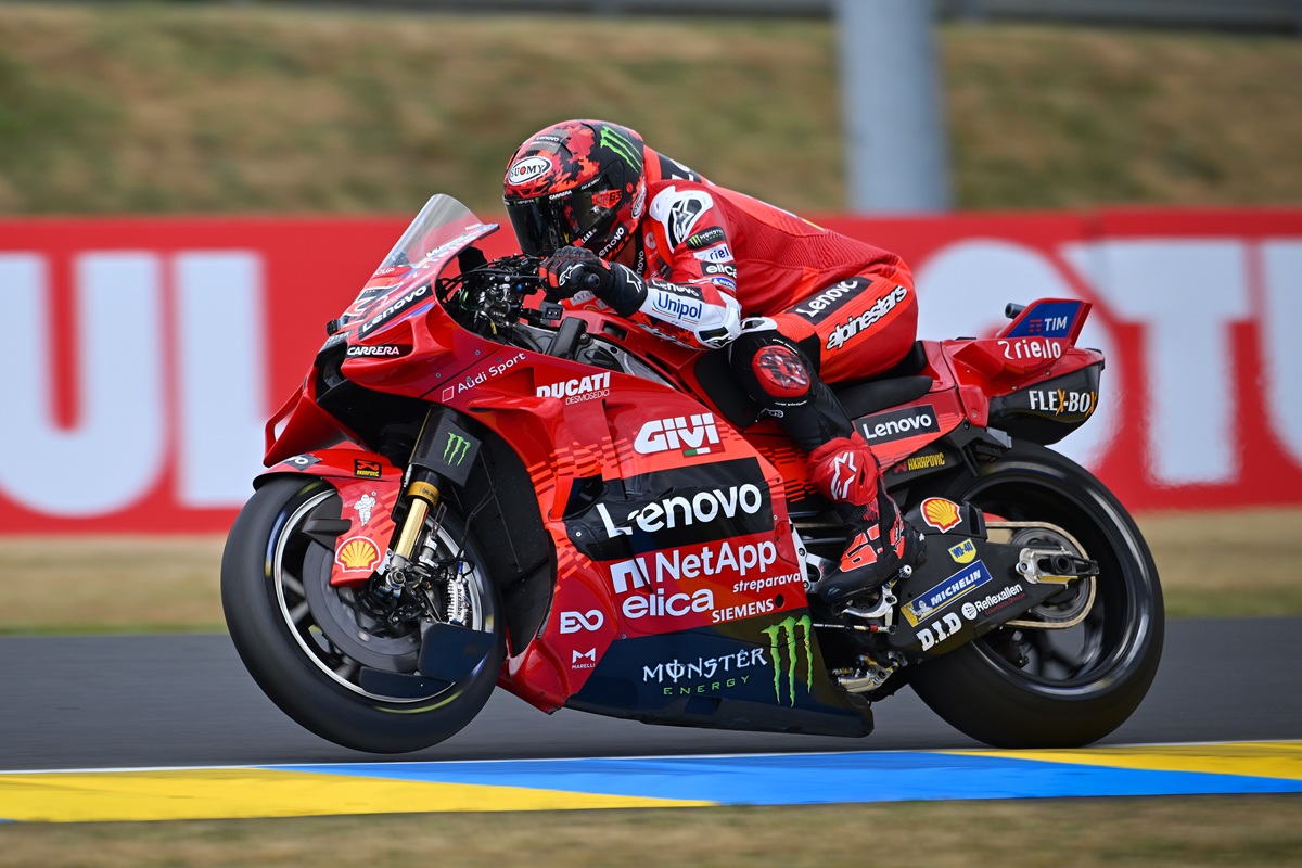 A corrida de Francesco Bagnaia no GP de França de MotoGP chegou ao fim prematuramente, com uma queda na curva 3 de Le Mans – desencadeada por um toque de Enea Bastianini (Red Bull KTM Tech3).