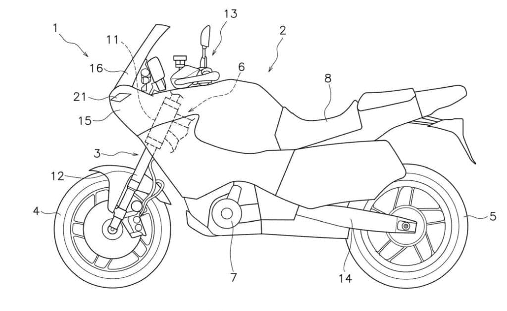 Os desenhos desta patente da Yamaha mostram a parte frontal de um duplo farol com um para-brisas ajustável eletronicamente acima dele. Entre as luzes está montada a câmara, que assim não requer suporte próprio.