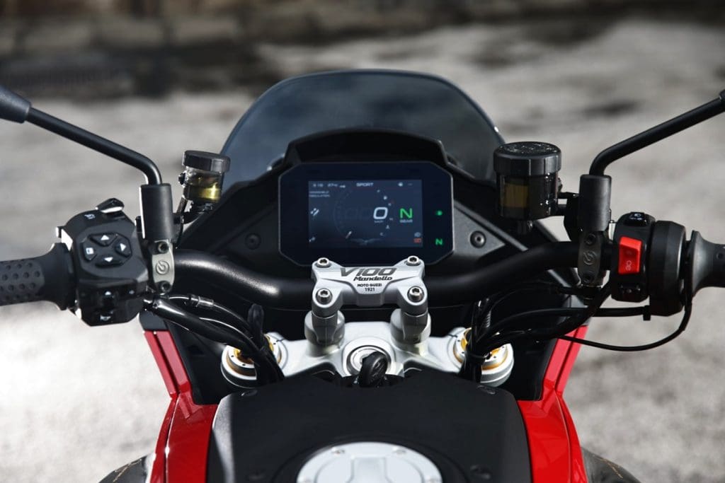 A V100 Mandello foi a primeira moto do mundo com aerodinâmica adaptativa, e agora a versão Wind Tunnel vem homenagear este legado. Tem uma decoração em vermelho, conjugado com detalhes e gráficos em preto.