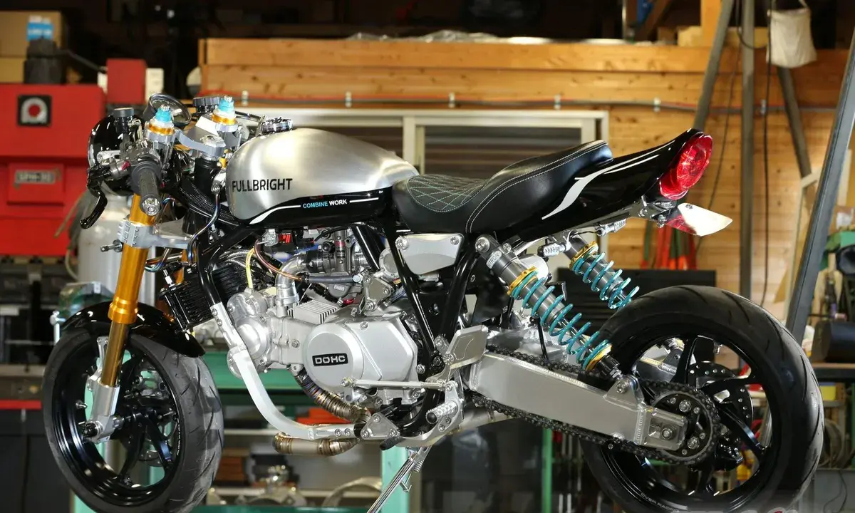 A lista de alterações mecânicas impressiona: motor preparado com kit Daytona DOHC Twin Cam de 124 cc, embraiagem hidráulica SP Takegawa, caixa de cinco velocidades, carburador Yoshimura de alto desempenho e escape único construído pela Fullbright. A suspensão dianteira recorre a peças RS125 adaptadas, enquanto atrás se destaca um conjunto Nitron. Rodas, travões, comandos e até o depósito foram profundamente revistos, criando uma moto tão compacta quanto refinada.