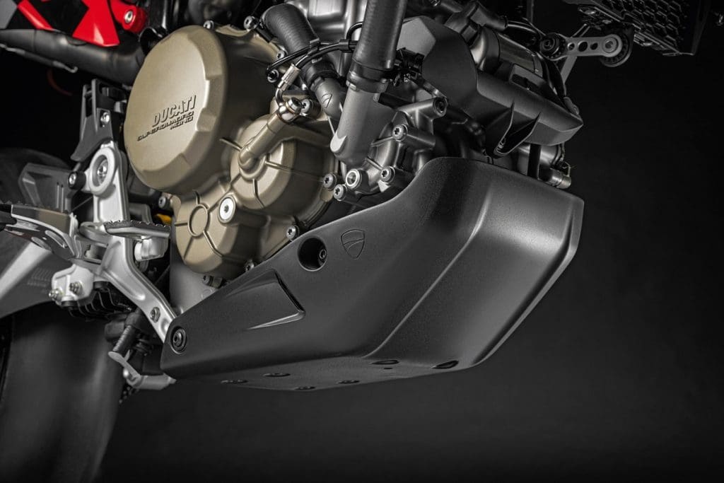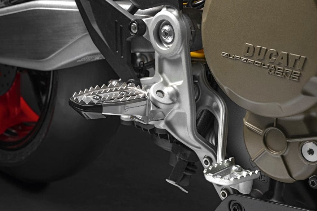 Ainda ao nível do design, mas não incluído no Sport Package, há vários componentes em alumínio maquinado feitos em colaboração com a Rizoma – espelhos retrovisores sólidos e resistentes com processamento 3D; reservatórios de óleo para o travão dianteiro e a embraiagem com suportes dedicados no painel de instrumentos; e manetes de travão e embraiagem ajustáveis em preto anodizado com a inscrição contrastante «Ducati». São articuladas, para manterem a funcionalidade em caso de queda.