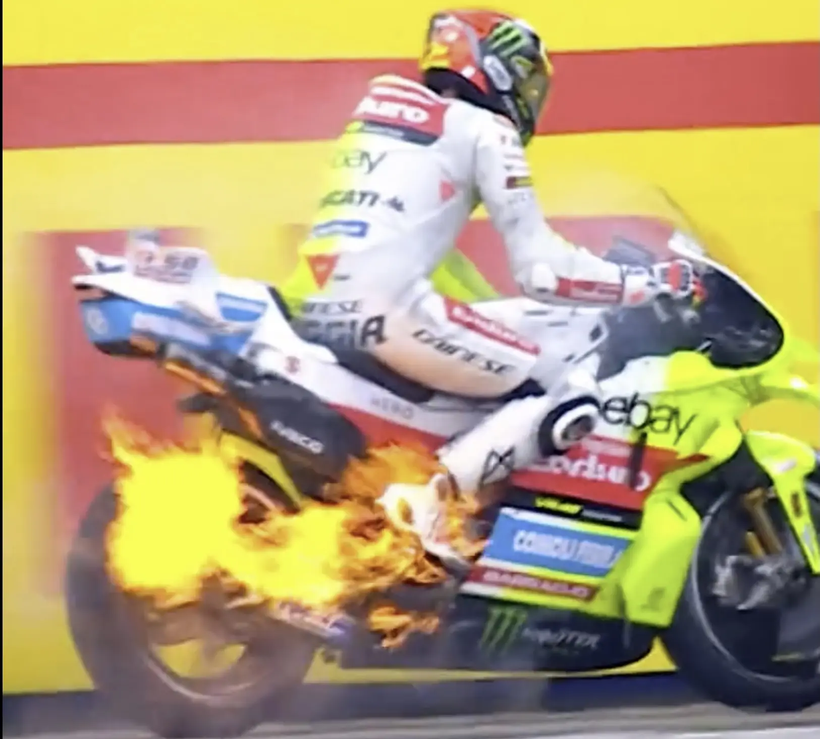 Enquanto o drama se desenrolava em pista, Di Giannantonio apercebeu-se dos primeiros sinais de perigo — uma súbita nuvem de fumo branco a sair da sua moto. Mas a situação agravou-se rapidamente, passando de aviso a emergência total, quando labaredas começaram a jorrar.