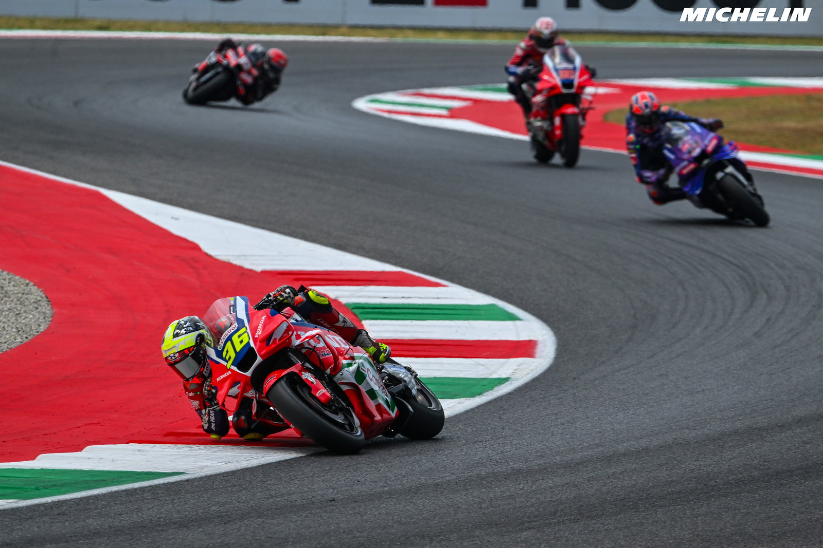Depois de mais uma prestação difícil em Mugello, Mir voltou a tocar no ponto que mais o incomoda: ‘A aderência. Se tivermos aderência, a aceleração melhora. Depois já não teremos velocidade de ponta, mas, por exemplo, a Yamaha nunca foi uma moto com muita velocidade de ponta no passado e ganhou muito’.