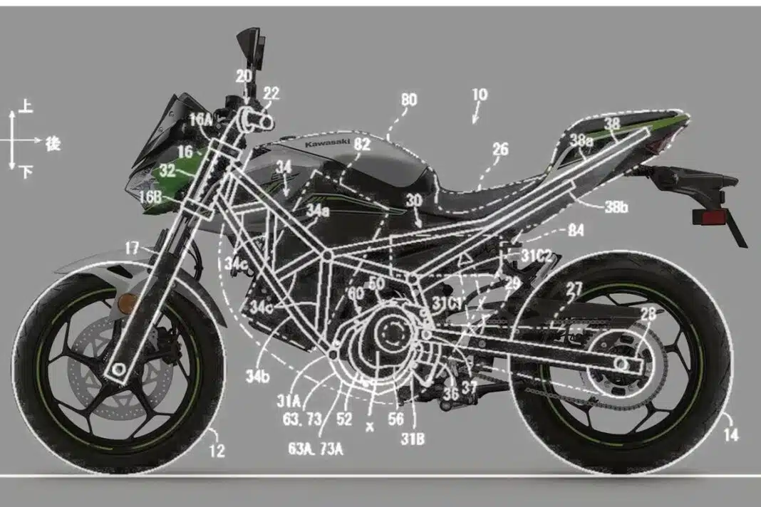 Este tipo de abordagem permite à Kawasaki desenvolver motos elétricas com características distintas — por exemplo, uma naked urbana e uma desportiva leve — partilhando a mesma espinha dorsal estrutural. As imagens associadas à patente mostram uma configuração que recorda os atuais modelos elétricos da marca, como a Kawasaki Z e-1 e a Kawasaki Ninja e-1, embora com diferenças importantes na forma como o motor é integrado.