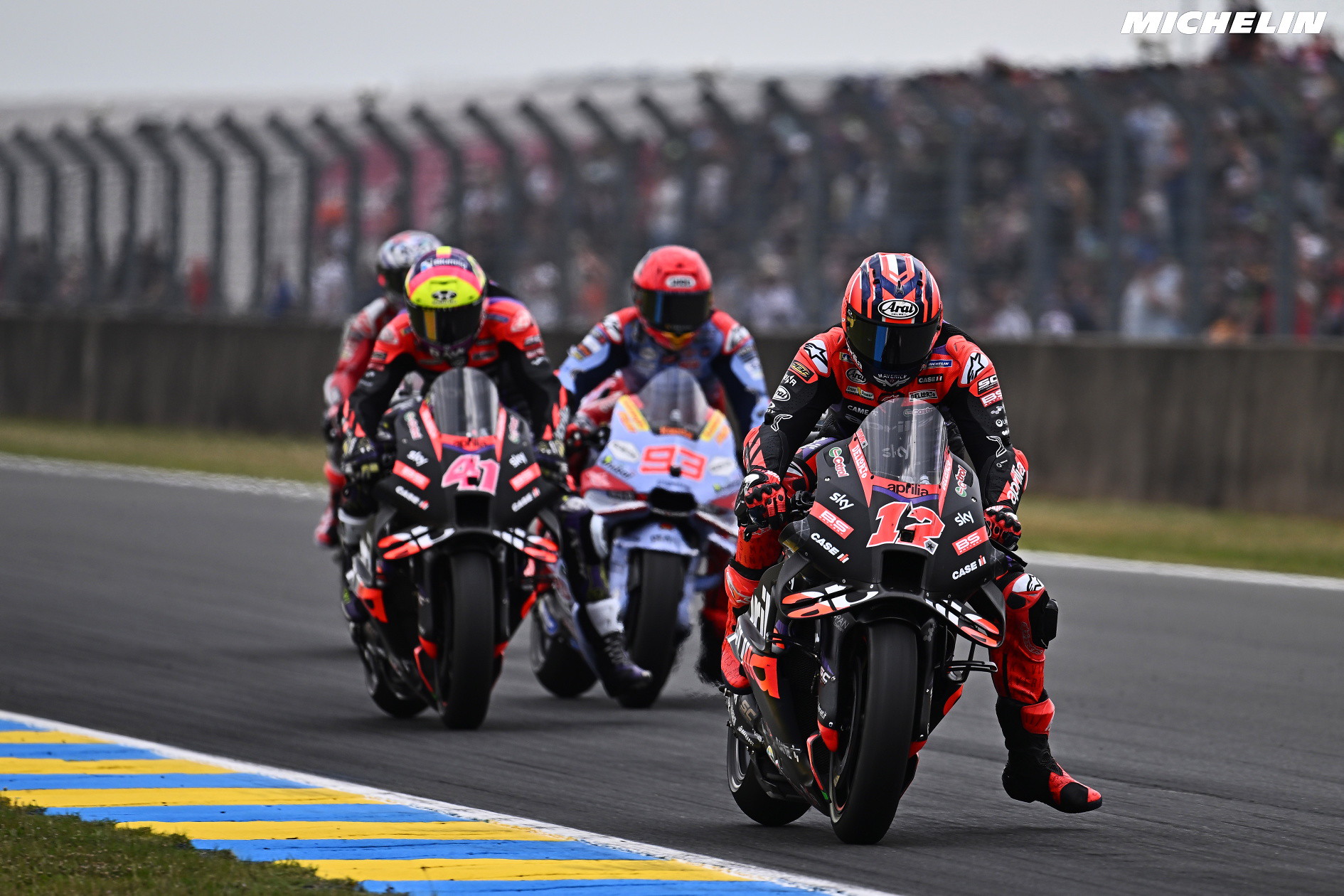 O piloto da Aprilia recordou um momento da corrida em que teve algumas batalhas interessantes, mas não conseguiu fazer mais devido às condições dos pneus: ‘Defendi a posição porque realmente acreditei que tinha muito mais na altura. Depois, com o DiGia [Fabio Di Giannantonio], diminuímos a diferença. Passei ao lado, cometi um erro e o Marc [Márquez] passou-me por dentro, mas depois ele esteve lá o tempo todo. E quando ultrapassamos o DiGia, acreditei realmente que tínhamos ritmo para alcançar os que estavam na frente. Na verdade, vi-os perto e de uma volta para a outra, sete décimos mais lentos. Não tenho conseguido fazer muito mais. Meu pneu caiu muito’.