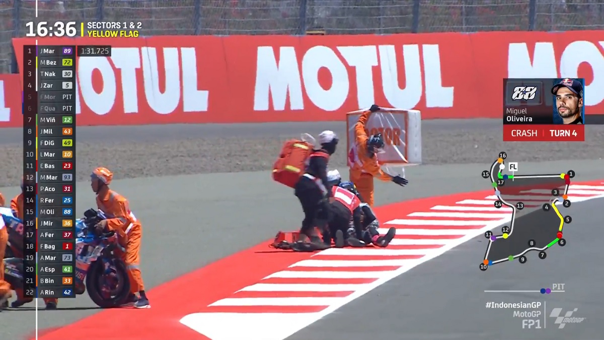 Não começou bem para Miguel Oliveira o GP da Indonésia de MotoGP. O piloto estava na sua segunda sequência de voltas quando sofreu um forte highside na curva 4 de Mandalika, tendo de ser encaminhado ao centro médico.