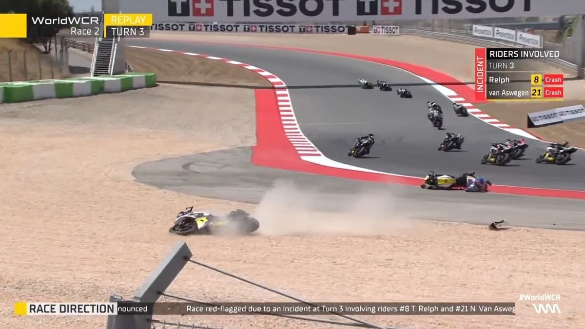A segunda corrida do Mundial de Motociclismo Feminino (WorldWCR) em Portimão acabou da pior forma possível para Nicole van Aswegen e para Tayla Relph – que se envolveram num acidente assustador logo na terceira curva.