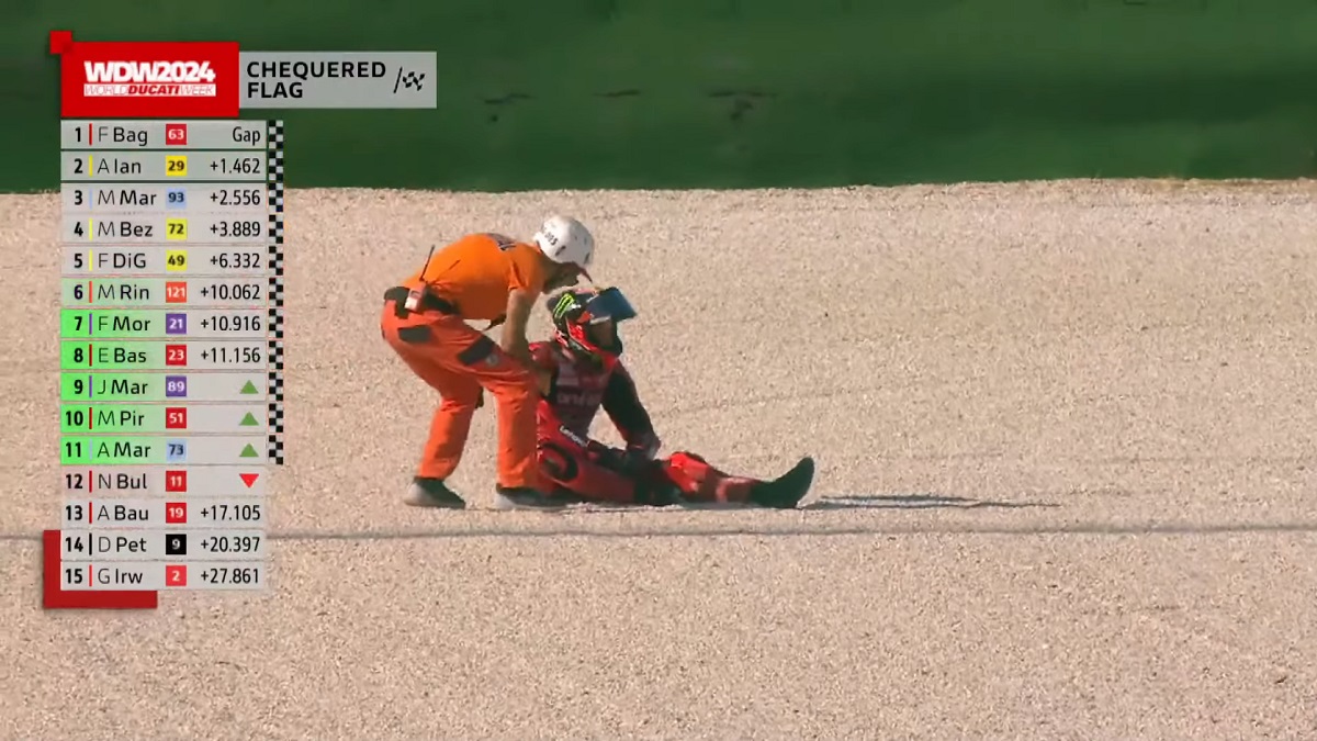 A última curva da Lenovo Race of Champions da Ducati, realizada esta tarde em Misano, ficou marcada por um acidente entre Marc Márquez e Nicolò Bulega. O espanhol ultrapassou o italiano e parece ter havido um toque, que levou o italiano a perder o controlo da moto e cair com algum aparato.