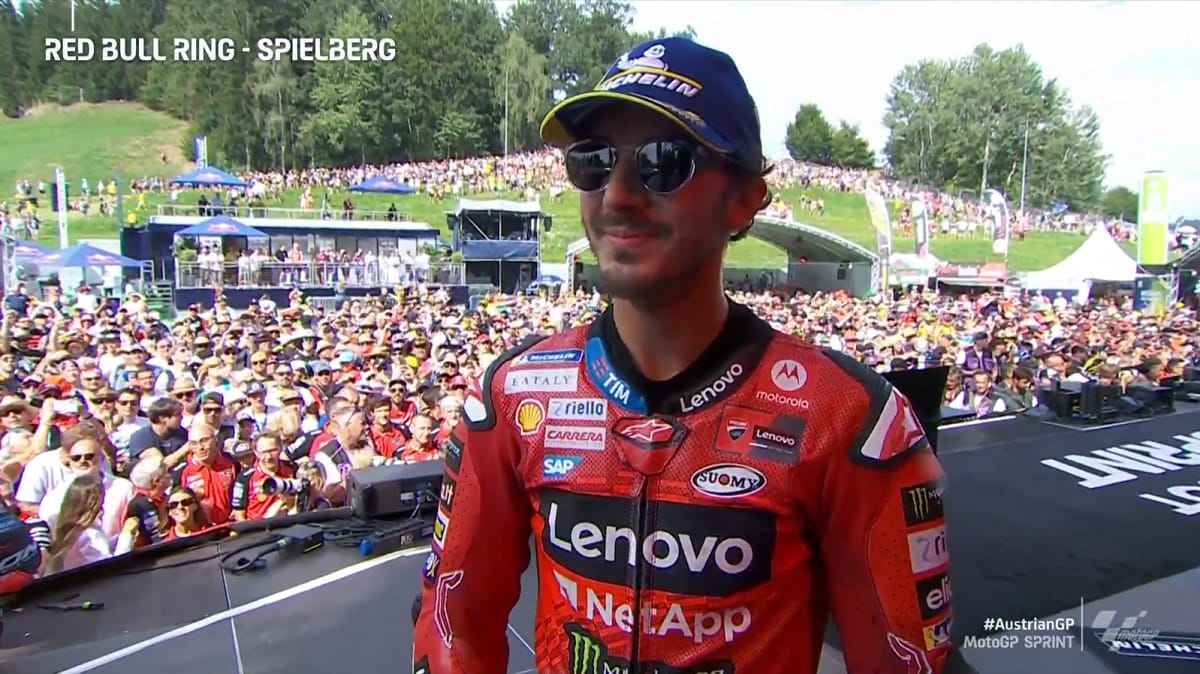 Francesco Bagnaia está de volta às vitórias nas corridas Sprint. O piloto da Ducati dominou a prova do GP da Áustria este sábado, cortando a meta na frente de Jorge Martín (Prima Pramac/Ducati).