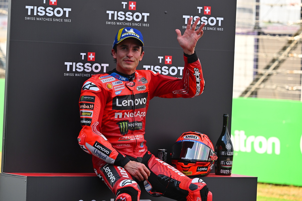 Márquez também falou da gestão do travão traseiro, de modo a controlar os bloqueios da roda dianteira: ‘Tive pequenos bloqueios, mas depois estava simplesmente a puxar muito pelo travão traseiro, porque o Pecco [Bagnaia] é tão bom aí – ele tem um travão de polegar e é bastante bom nessa área. Por esse motivo, ele está a travar bastante tarde. Tentei toda a pré-época e não consigo. Se virem, a minha perna estava a empurrar muito, mas depois libertava na parte final e tinha um pequeno bloqueio. Mas como sempre, numa corrida podes gerir as situações, mas há dois, três, quatro momentos na corrida em que precisas de correr risco máximo. E é aí que não podes cometer quaisquer erros. Nesta corrida, gerimos bem’.