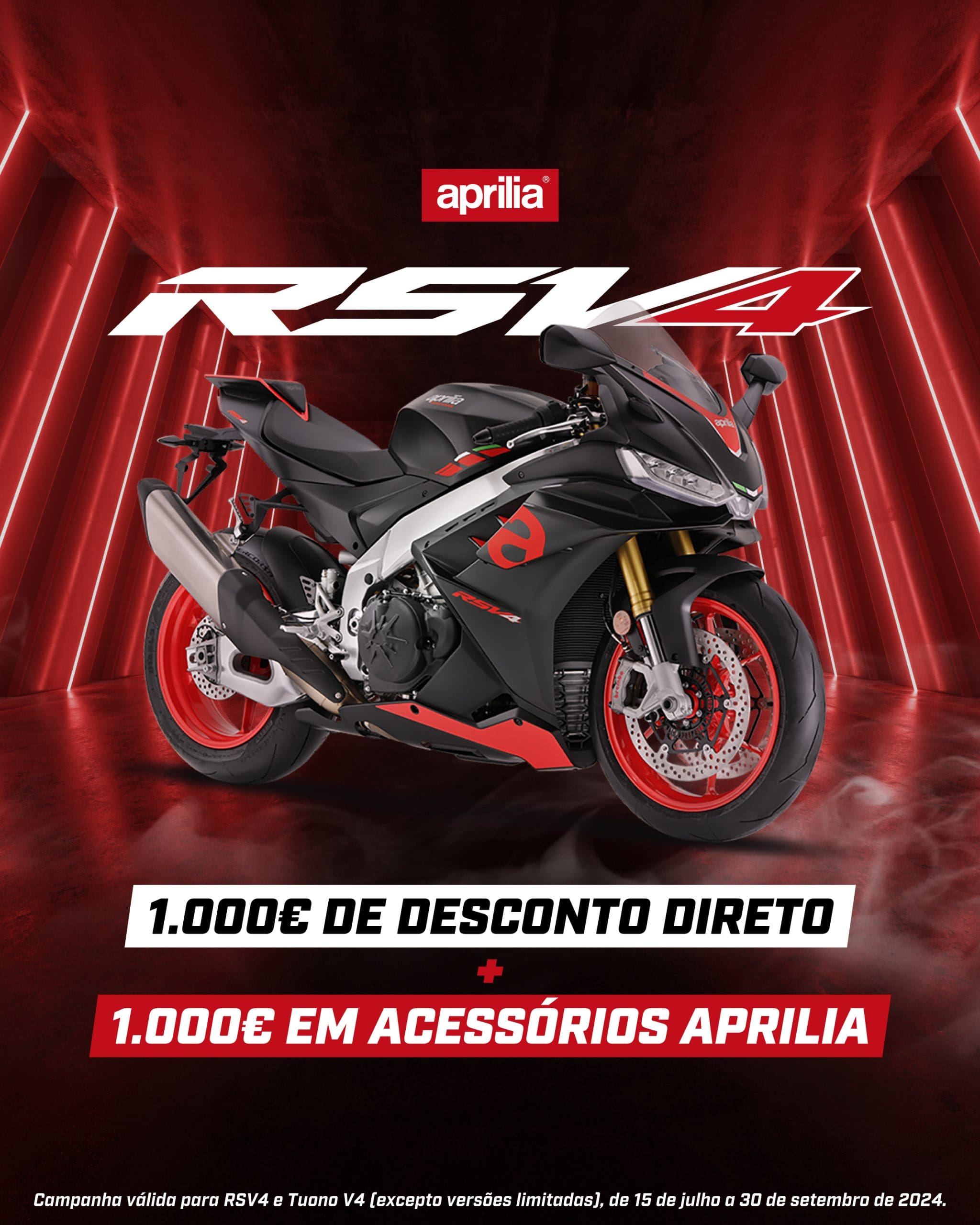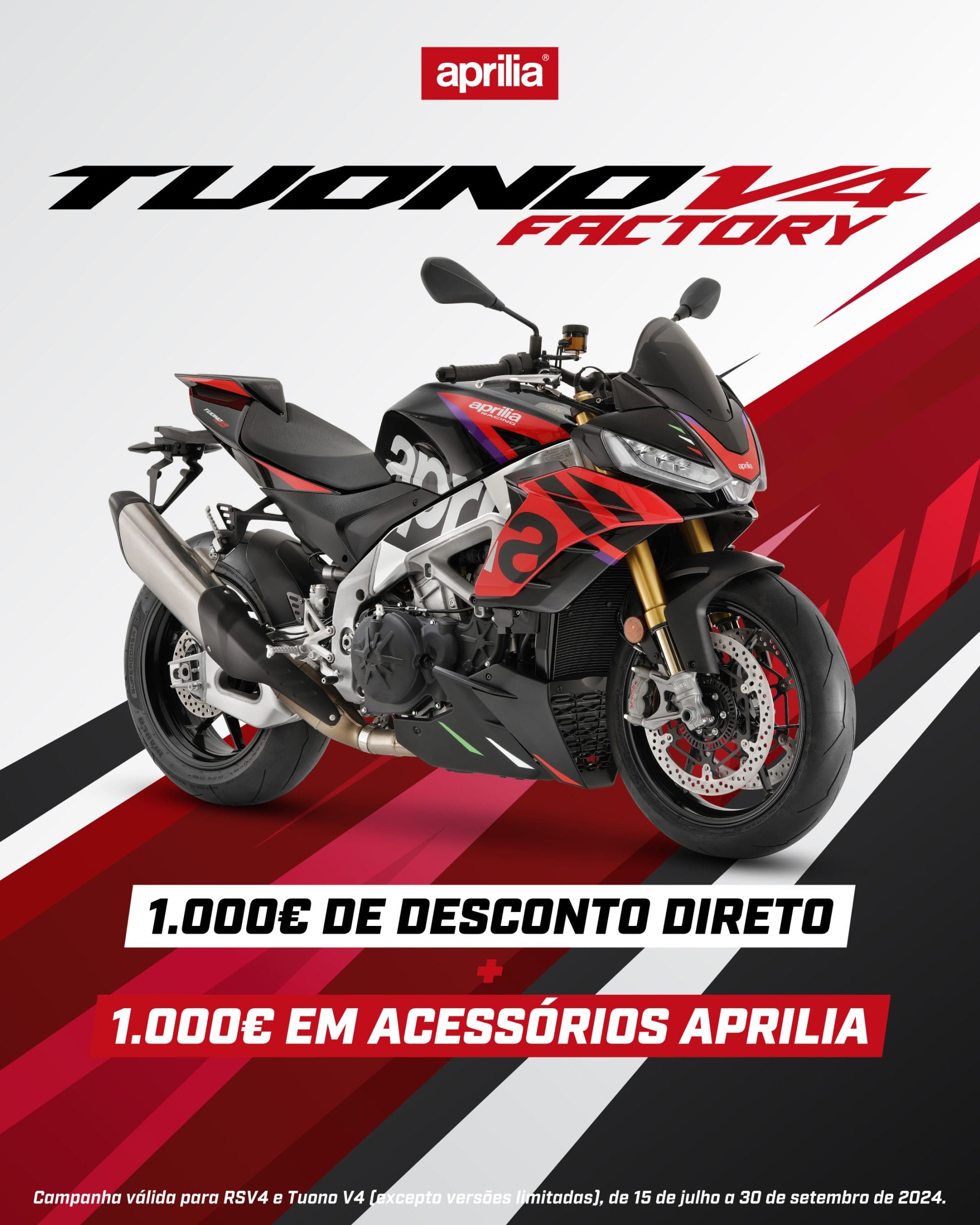 A Aprilia Portugal anuncia uma campanha imperdível para os apaixonados por adrenalina e performance: descontos de 1.000€ em motos selecionadas e oferta de 1.000€ em acessórios originais da fabricante.
