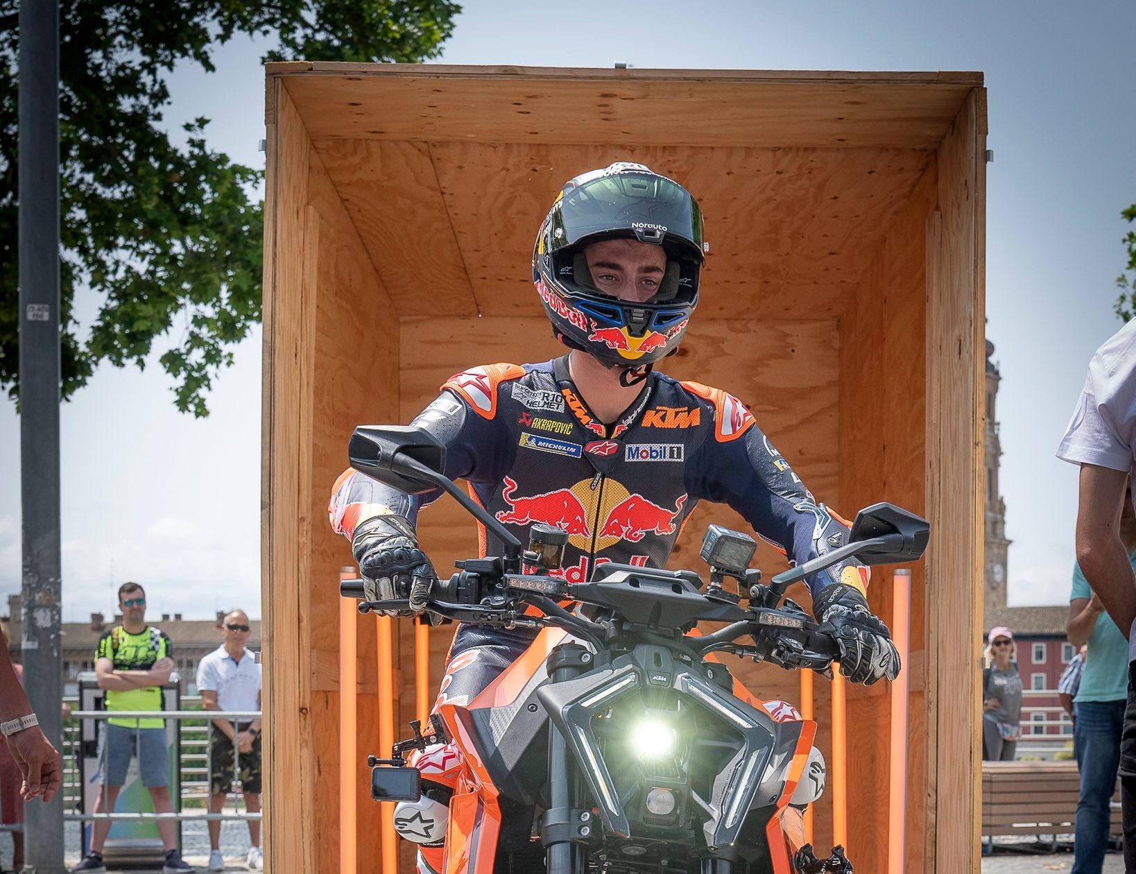 Afinal, o mistério da enorme caixa colocada esta semana em Zaragoza tinha nome e motor: Pedro Acosta. O piloto da Red Bull KTM apareceu no centro da cidade a bordo de uma imponente KTM Super Duke 1390, depois de emergir, com estilo, de uma caixa instalada no Balcón de San Lázaro.