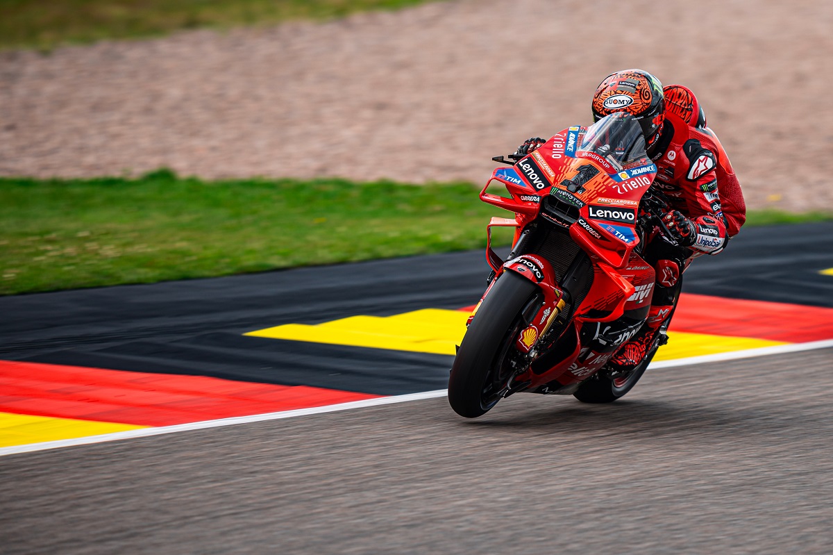Francesco Bagnaia foi o vencedor do GP da Alemanha de MotoGP, depois de passar boa parte da corrida a perseguir Jorge Martín (Prima Pramac/Ducati). O piloto da Ducati, que também chegou a estar de Franco Morbidelli (Prima Pramac/Ducati) em terceiro, acabou por herdar a liderança na penúltima volta com a queda de Martín.