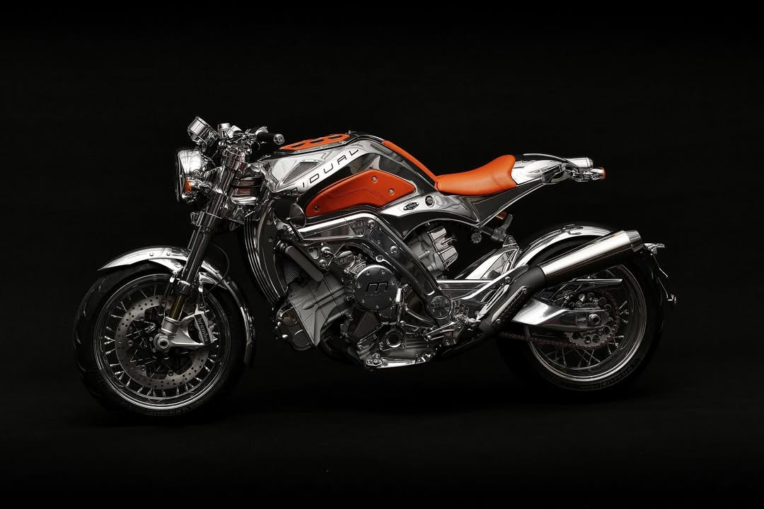 Os acabamentos cromados contrastam com os estofos em couro cor-de-laranja. Inspirada em automóveis e até em aviões, tem vários mostradores circulares no depósito de combustível e um conta-quilómetros analógico.