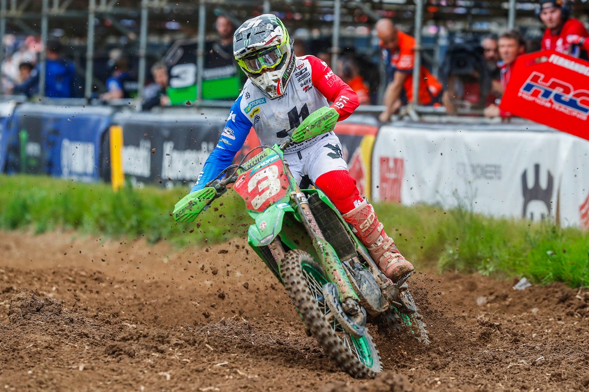 A primeira corrida deste domingo começou com o holeshot de Lucas Coenen (Red Bull KTM), que assim se colocou na liderança, com o colega de equipa Jeffrey Herlings em segundo. O holandês esteve no encalço do líder durante parte da corrida, mas Coenen resistiu… e Herlings viria a perder o segundo posto para Romain Febvre (Kawasaki).