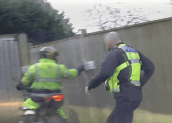 Um motociclista em excesso de velocidade que escondeu ou não exibiu a matrícula e causou perigo a outros utentes da ...