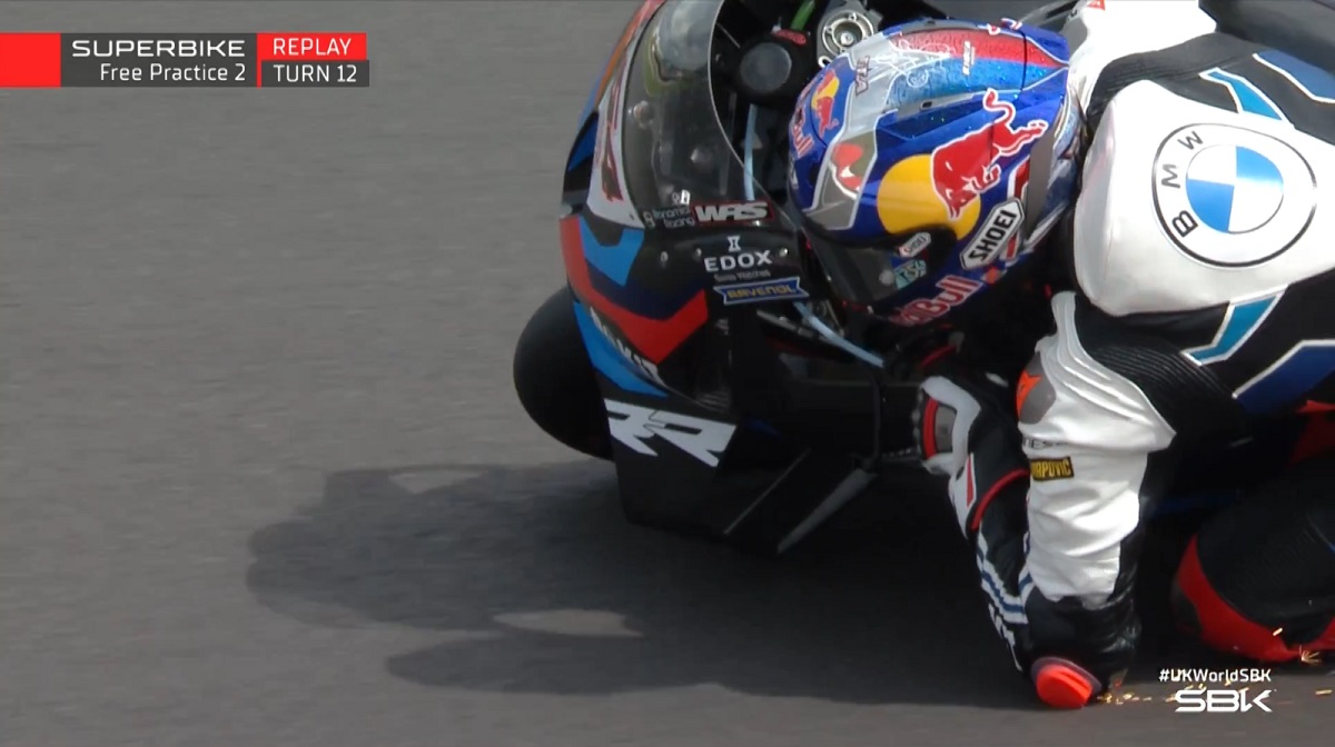 O piloto da ROKiT BMW perdeu o controlo da parte frontal da sua M 1000 RR e, de modo a não cair, teve de se apoiar no joelho e até no cotovelo esquerdos – fazendo lembrar alguns dos «saves» épicos a que Marc Márquez habituou os espectadores.