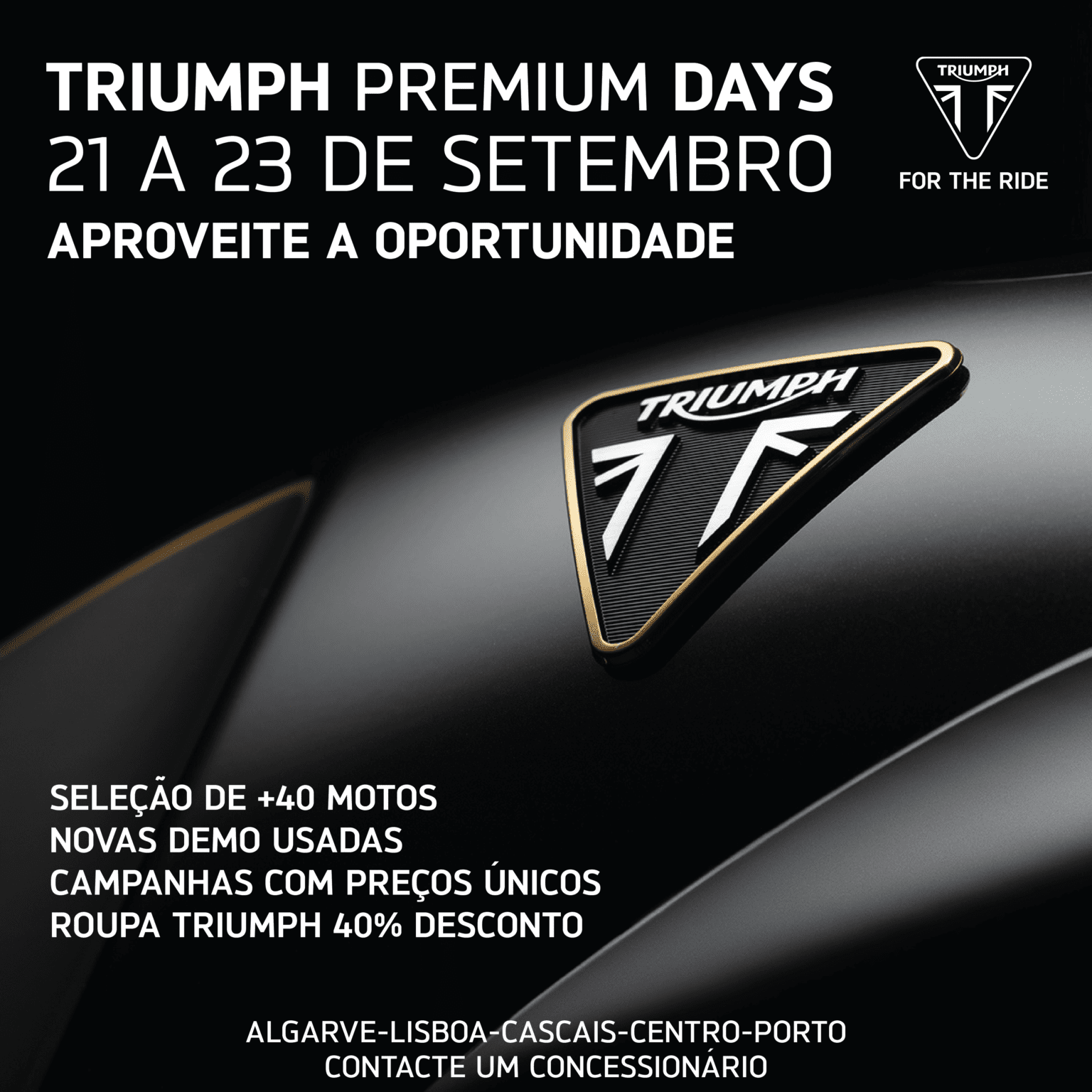 OS PREMIUM DAYS da Triumph têm lugar em todos os concessionários nacionais da prestigiada marca britânica – Lisboa, Porto, Algarve, Centro(Pombal) e Cascais – e oferecem preços de aquisição de motos Triumph novas, usadas ou de serviço, com base em campanhas únicas para esta ocasião e, se for o caso, com excelentes condições de financiamento.