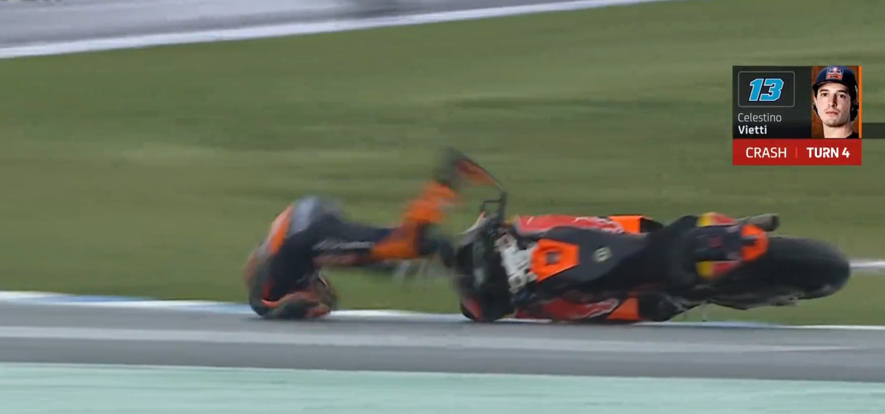 Com a chuva a fazer-se sentir durante a manhã na Austrália e algumas quedas, Celestino Vietti sofreu uma das mais duras durante o FP1 do Moto2, e depois do aparato inicial onde se viu a dureza do impacto no chão, surgem agora notícias de que o piloto foi declarado como não apto para correr. Em causa está uma fratura da clavícula.