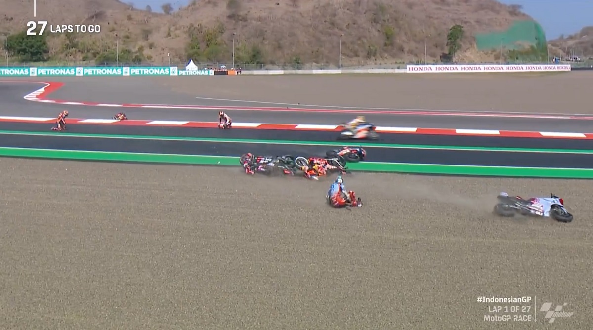 Também seguiam lá perto Aleix Espargaró (Aprilia) e Luca Marini (Repsol Honda), que foram apanhados no acidente sem terem tempo de reação possível. Joan Mir (Repsol Honda) perdeu muito tempo, mas conseguiu esquivar-se pela escapatória.