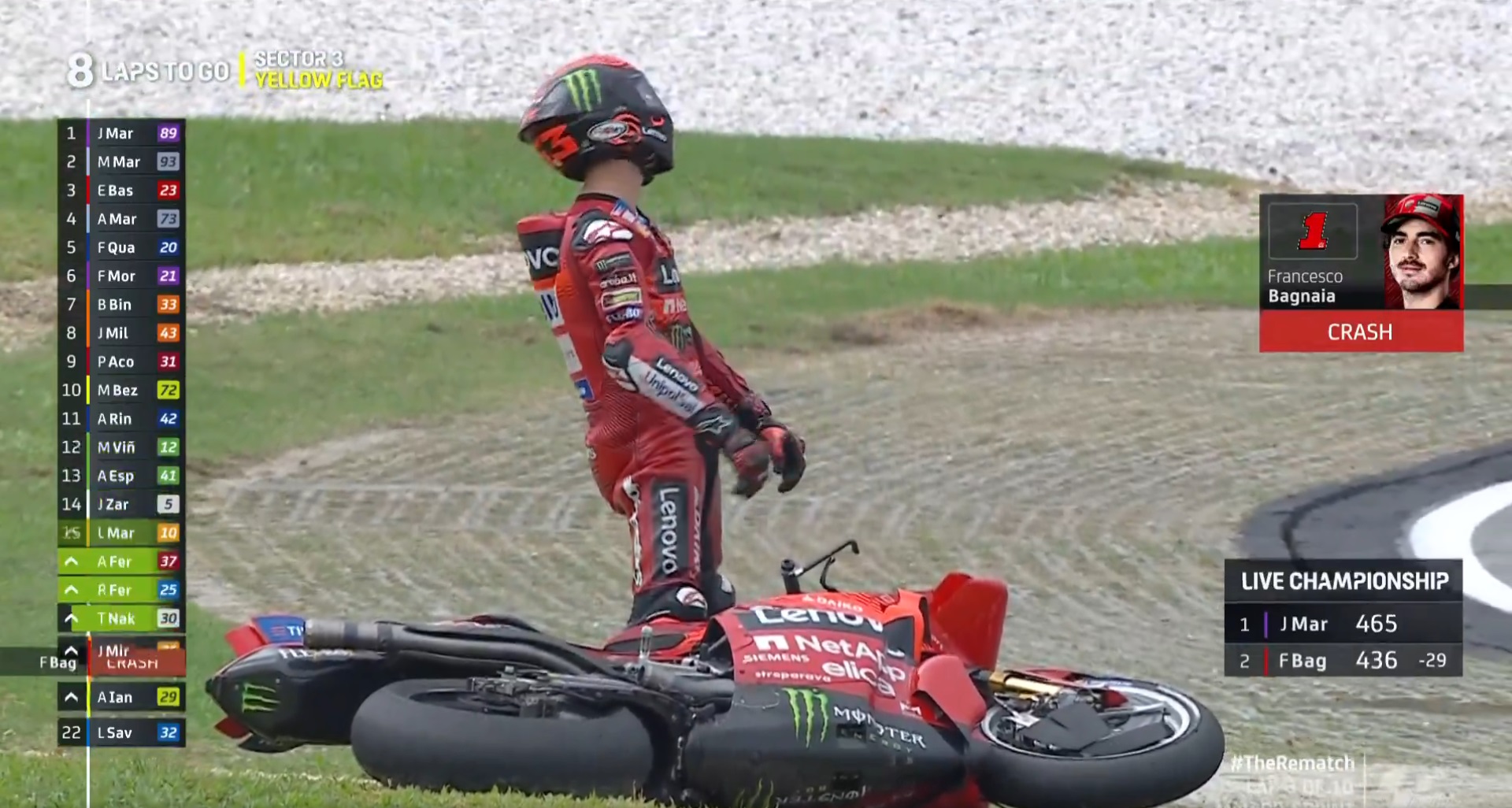 Bagnaia havia dominado todo o fim de semana na Malásia e garantido a pole position mas na Sprint e ao cabo de duas voltas era segundo, com Martín a passar para a frente logo no início mas o pesadelo, e o pior cenário estava para chegar!