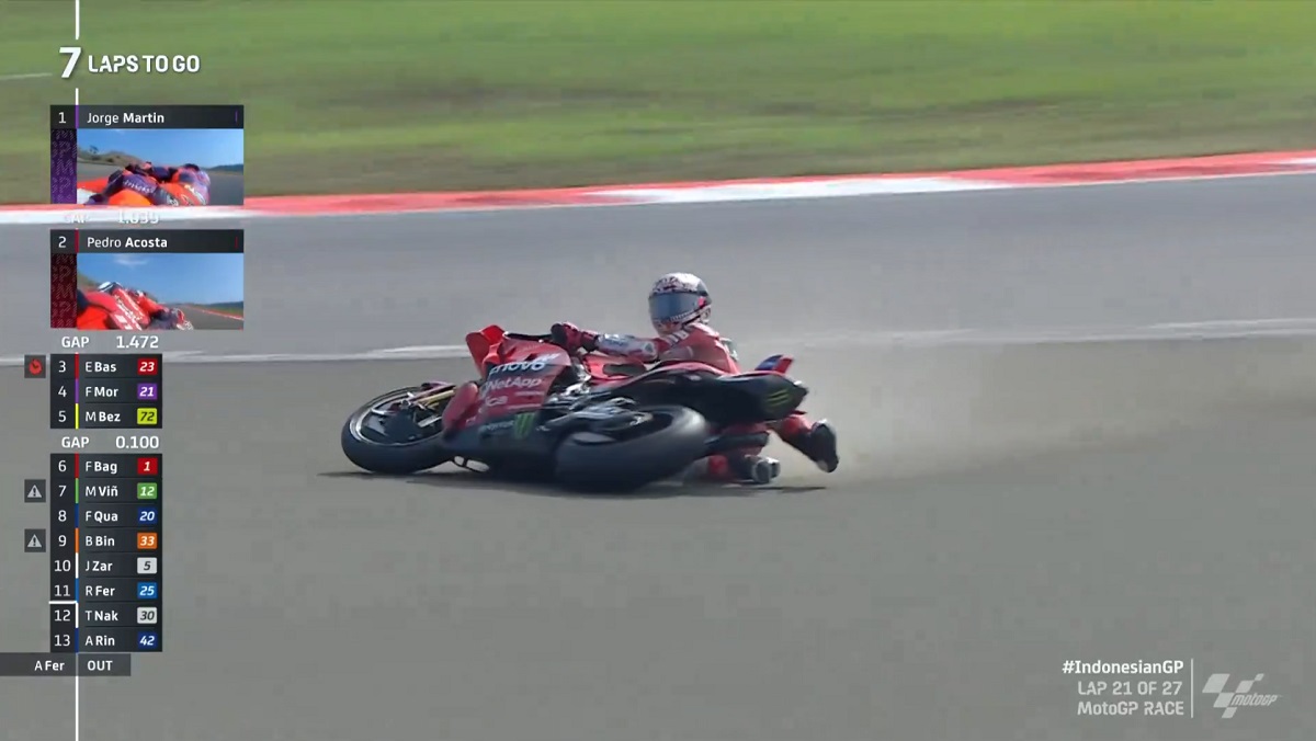 The charge is over! A tyre-whispering masterpiece ends up in the gravel 💥@Bestia23 CRASHES OUT OF THE PODIUM 💔#IndonesianGP 🇮🇩 pic.twitter.com/jJqkVgWeAb