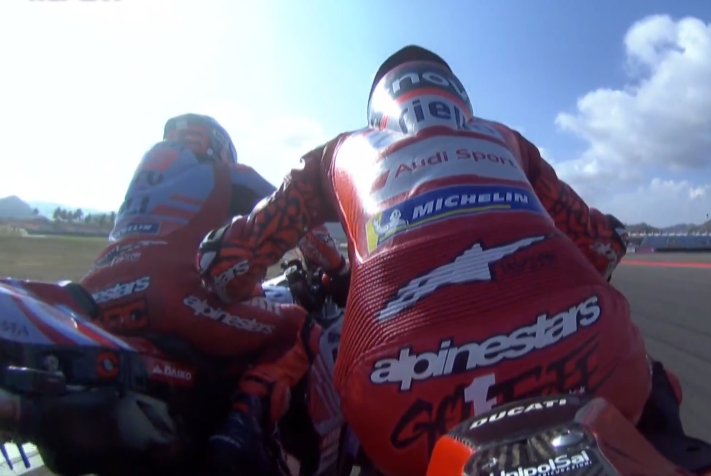 Vídeo: «Herói» improvável – Pecco Bagnaia à boleia de Marc Márquez, literalmente, após italiano ter ficado sem combustível em Mandalika