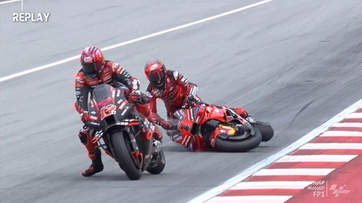 Já depois dos 45 minutos de sessão, Francesco Bagnaia envolveu-se num incidente invulgar durante o primeiro treino livre do GP Solidário de Barcelona de MotoGP.