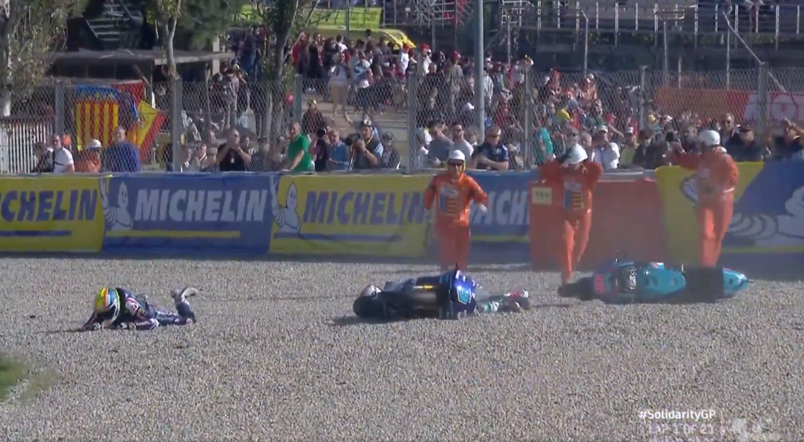 Pouco depois do arranque da corrida o piloto da Fantic Racing e da Gresini Moto2 tiveram um pequeno toque na corrida e acabaram por seguir para a gravilha do circuito espanhol, onde a queda de ambos acabou por se consumar.