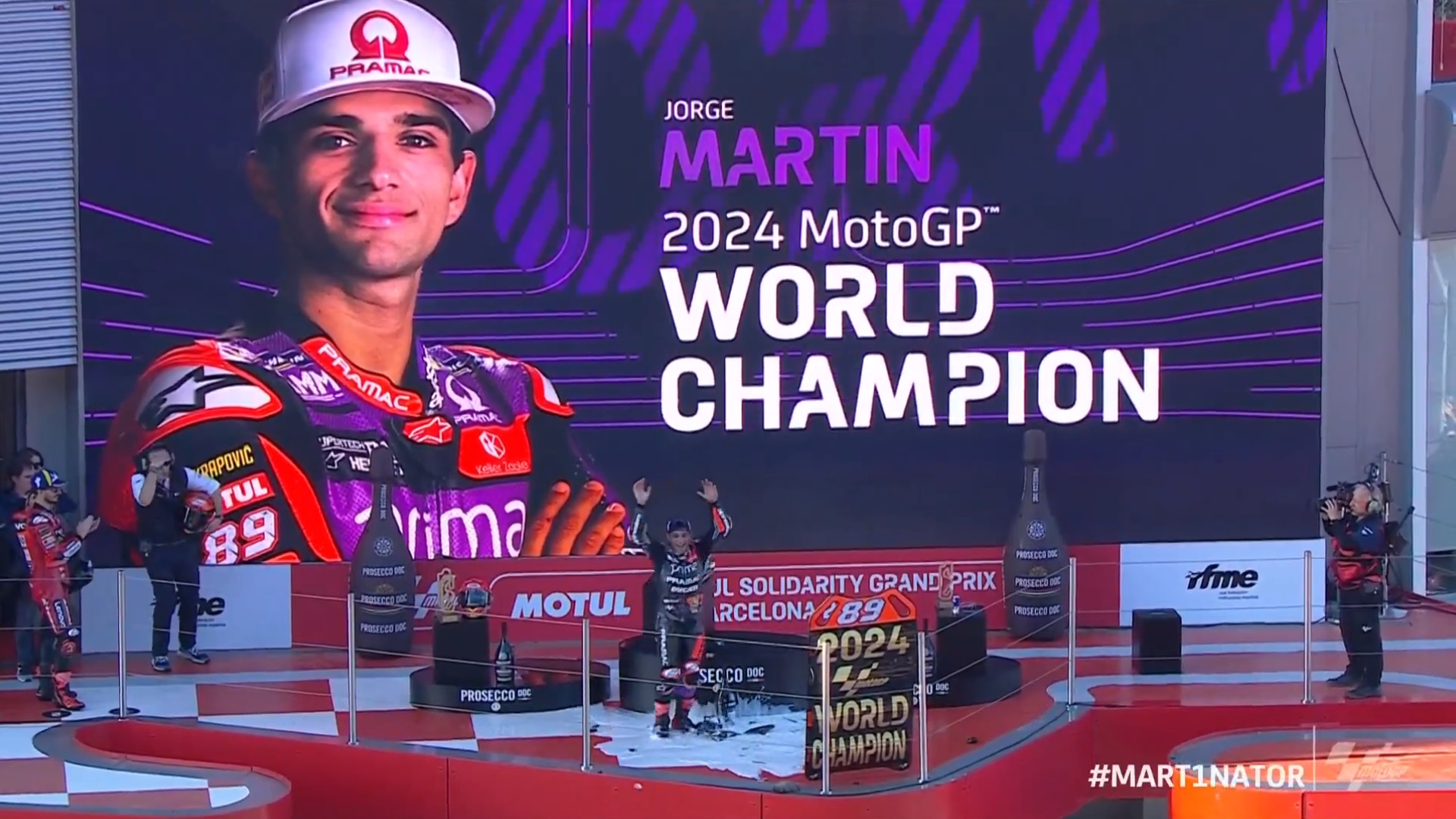 Super efusivo e a festejar merecidamente o título de MotoGP acabado de conquistar hoje em Barcelona, Jorge Martín está com a força toda e está a partir tudo, ou quase tudo… literalmente. A sua Ducati Desmosedici sofreu, nem como as celebrações no pódio.