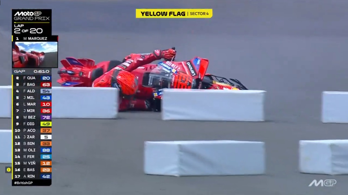 As duas primeiras voltas do GP da Grã-Bretanha de MotoGP foram nefastas para os irmãos Márquez. Na segunda, foi Marc a sofrer uma queda quando liderava.