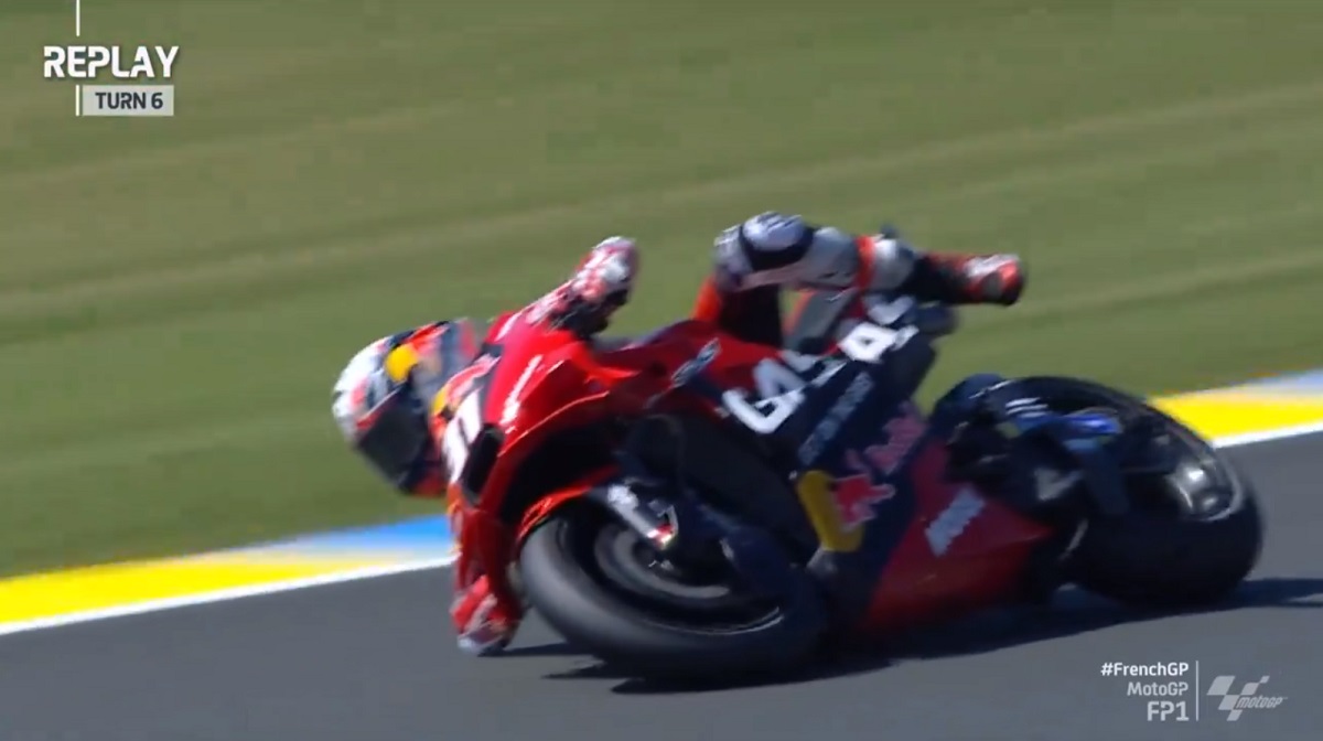 Pedro Acosta foi um dos pilotos mais velozes do primeiro treino livre do GP de França de MotoGP esta manhã em Le Mans, mas não deixou de apanhar um pequeno susto.