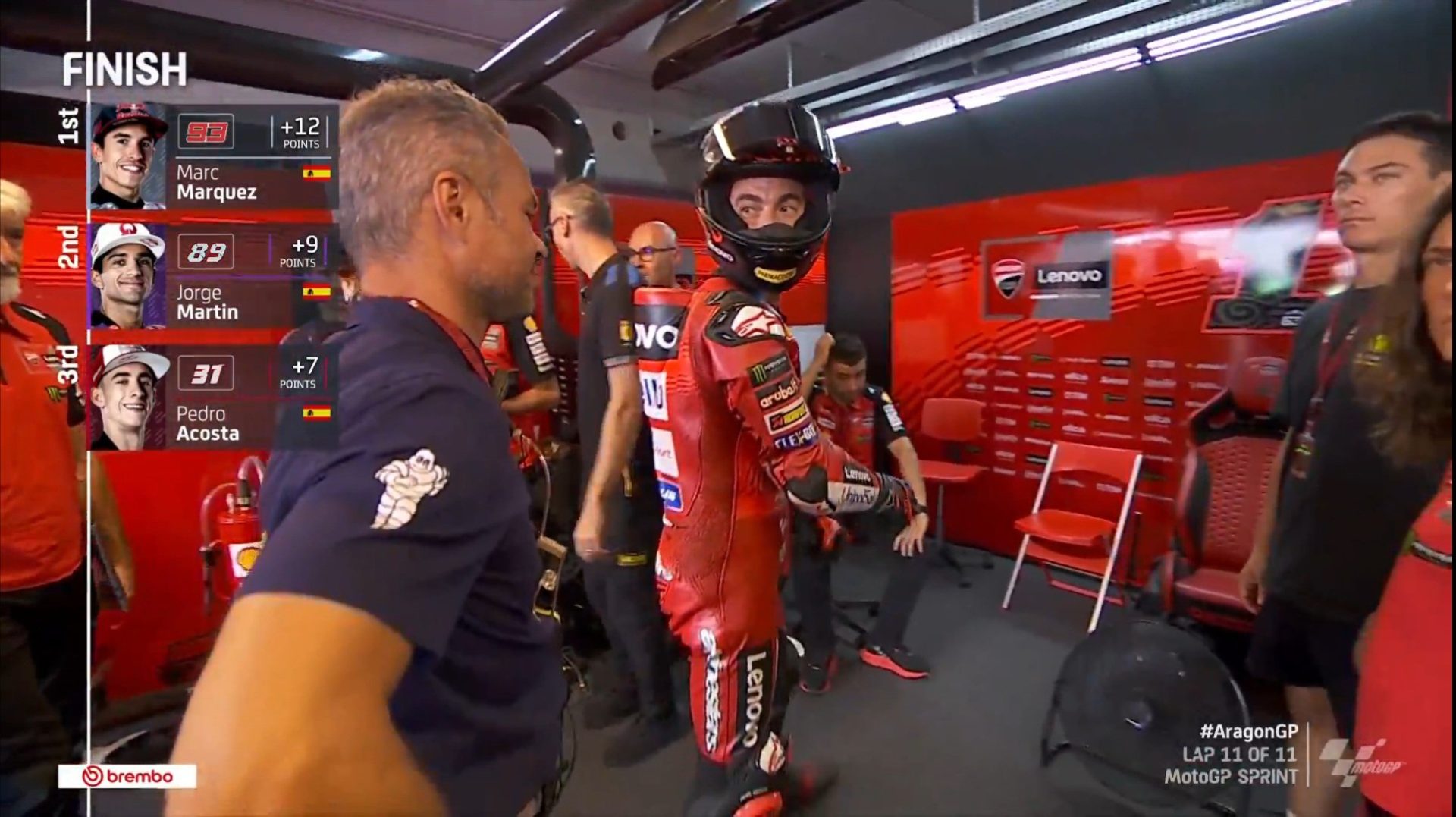 Francesco Bagnaia teve hoje na corrida Sprint uma prestação longe daquelas que tantas vezes nos presenteou e que começou desde logo em «marcha-atrás» depois de um arranque longe dos melhores. Durante a corrida pareceu ter sempre alguns problemas que «ajudaram» a que perdesse a liderança no campeonato e a julgar pelo seu olhar o «culpado» pode bem ter um nome…